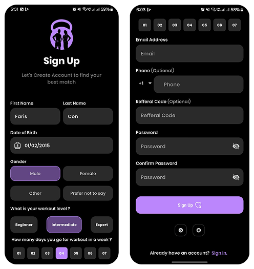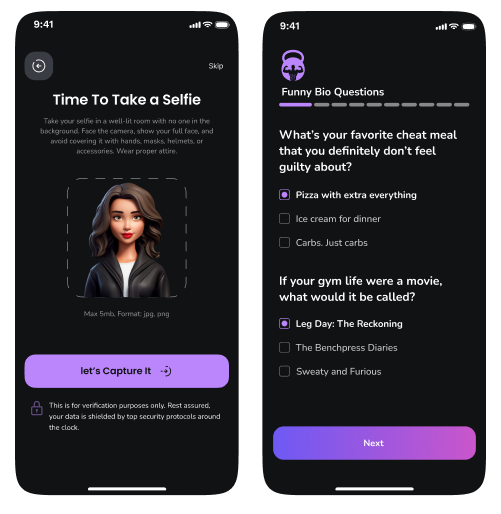 Tell us about your fitness goals, add your photos, and complete a quick selfie verification to ensure safety.